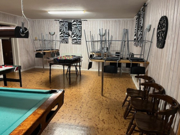 Den har ett stort fin samlingsrum med plats för 55 pers, ett nybyggt och modernt kök, en källare som inrymmer både biljardrum och ett speciellt rum för de yngre barnen med tv.